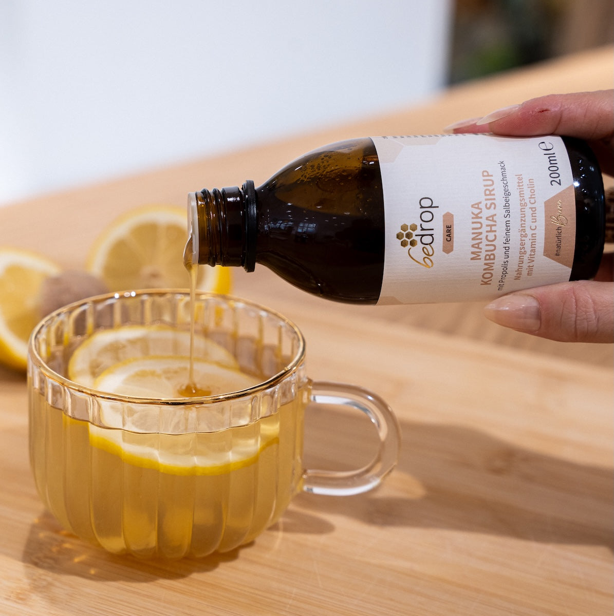 Unser Manuka Kombucha Sirup ist Dein natürlicher Begleiter für wohltuende Momente im Alltag – mit hochwertigem Manuka-Honig (500+ MGO), Propolis, Kombucha und ausgewählten Pflanzenextrakten wie Salbei, Ingwer und Thymian.