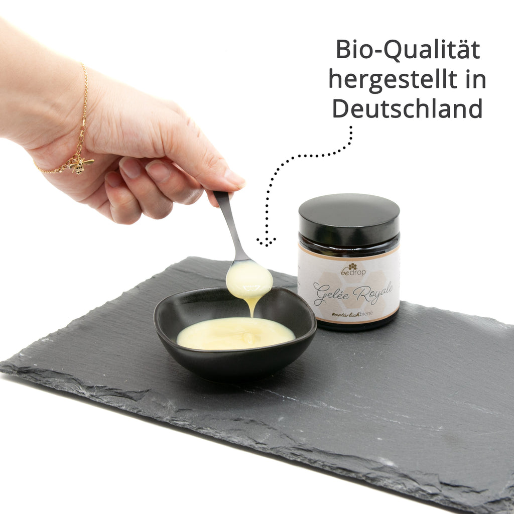La pappa reale di alta qualità è importante per la conservazione delle api e, in quanto tale, è anche un grande valore aggiunto per noi. Per questo motivo attribuiamo grande importanza a prodotti di alta qualità, naturali e premium. Ci riforniamo di pappa reale pura dai migliori apicoltori in regioni idilliache, prive di pesticidi e ricche di ossigeno, con molte piante e alberi diversi. La pappa reale che ci viene consegnata è liofilizzata. Questo processo garantisce non solo l'elevato contenuto di 10-HDA, ma anche molti polifenoli e flavionidi diversi.
